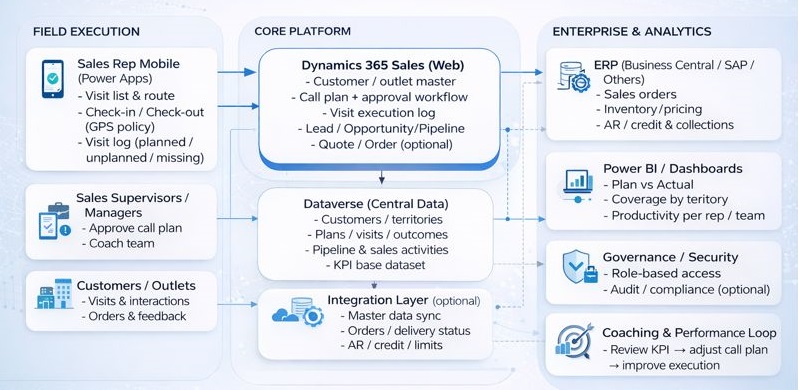 Sales Rep Mobile (Power Apps) → Dynamics 365 Sales (Call Plan/Visit/Opportunity/Order) → Dataverse → ERP (Orders/Inventory/AR) → Power BI (KPI/Dashboard).