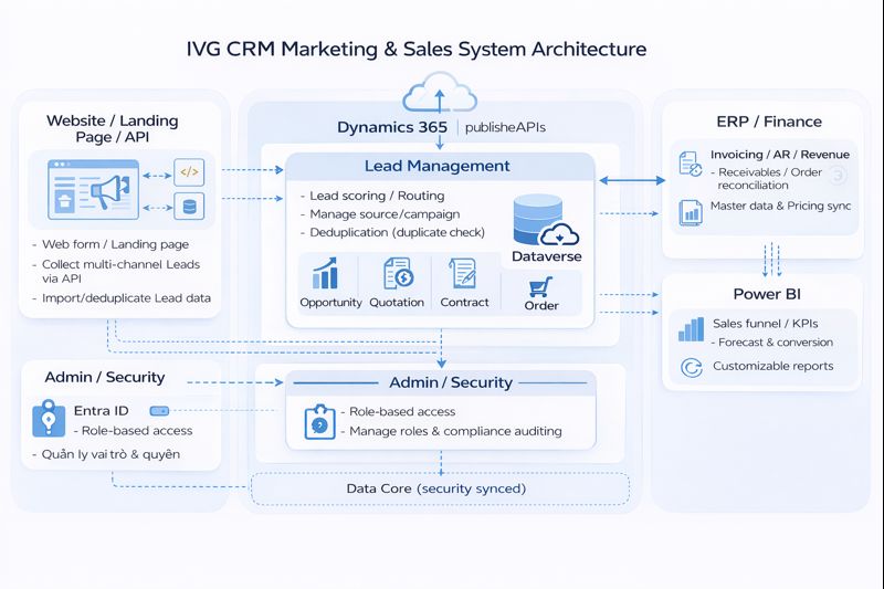 IVG Vietnam JSC – Chuẩn hoá quy trình Marketing & Sales trên nền Dynamics 365, tích hợp website/ERP và xây dashboard KPI theo nhu cầu.