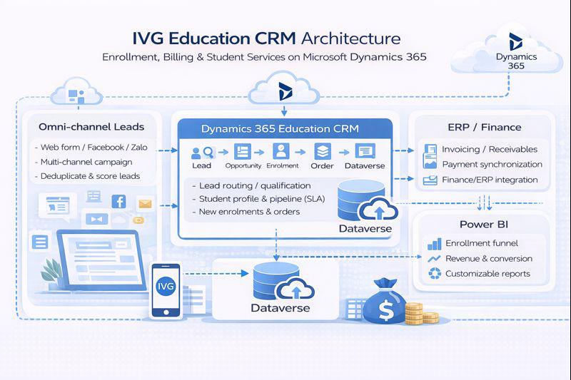 Giải pháp sử dụng Dynamics 365 (Sales/Customer Service) làm lõi quản trị tuyển sinh & chăm sóc, dữ liệu tập trung trên Dataverse, có thể tích hợp ERP/Finance để đồng bộ Order/Payment và xây dashboard trên Power BI.
